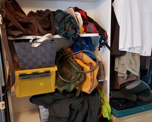 • Vooral in de winter is het handig dat alle huisgenoten een eigen mand, bak of zak hebben om mutsen, handschoen, sportspullen, regenpakken ed. in op te bergen. In de zomer kan deze ruimte gebruikt worden voor de kleinere schoenen en buitenspeelgoed.